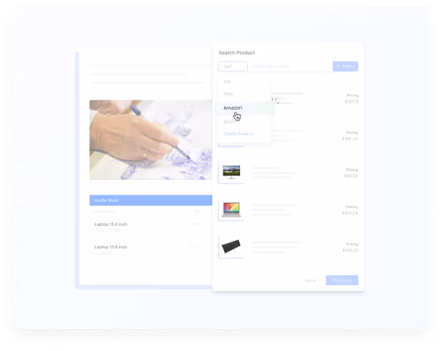 1. Document Editor Integration: Easily view and add Amazon products directly from the Document Editor. Select Amazon from the Product Catalog dropdown and log in with your Amazon credentials.