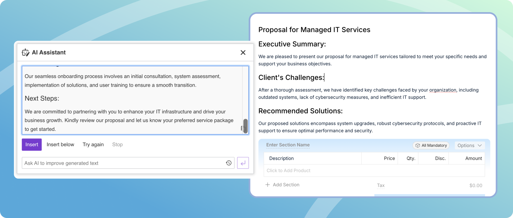 So we went back to the drawing board. The result is an editor built around how MSPs actually works creating client-facing proposals, SOWs, and service documents that need to look polished, come together quickly, and go through multiple rounds of review before they're ready to send.