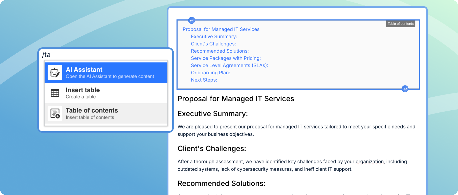 Long proposals and service agreements can get unwieldy fast. The new editor automatically generates a table of contents from your document headings, so you and your clients can navigate directly to any section in seconds.