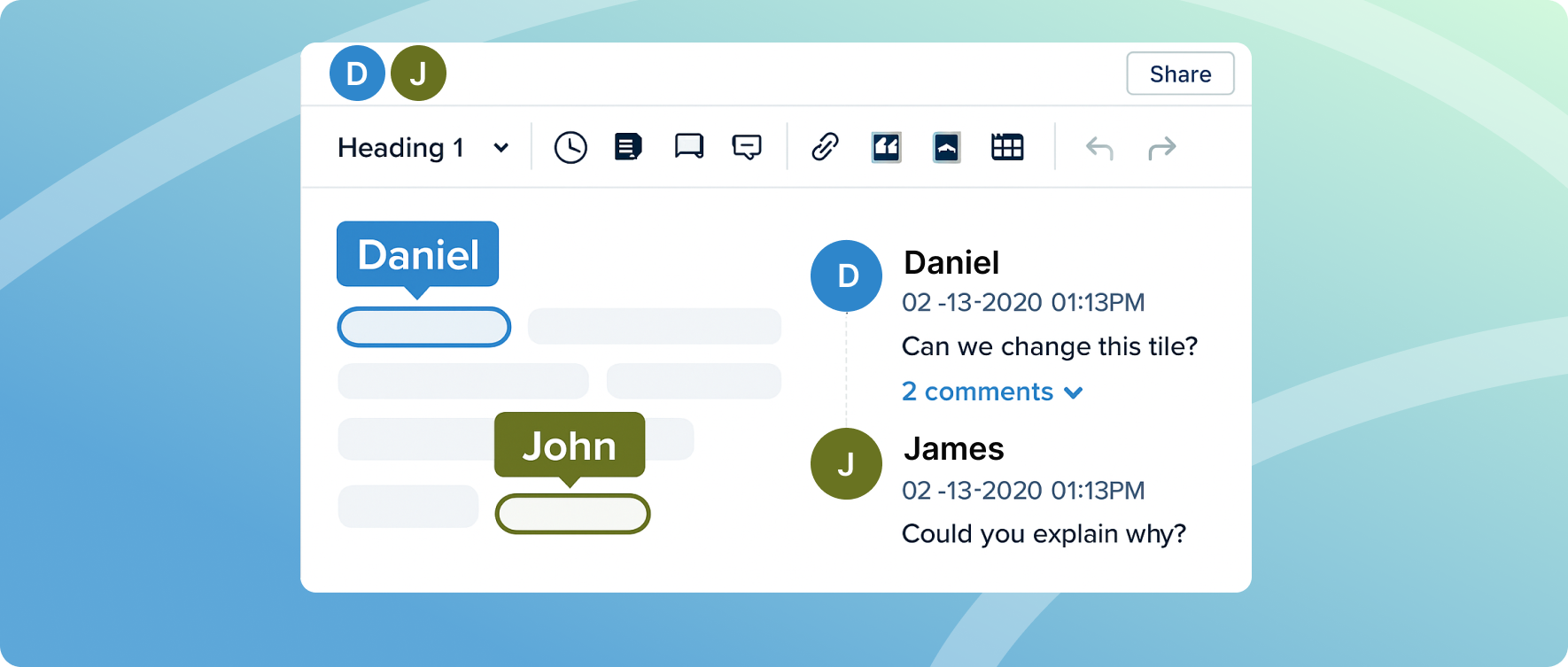 Feedback now lives inside the document where it belongs. Leave threaded comments, tag teammates with @mentions, and resolve discussions without a single external message. The context stays with the content.