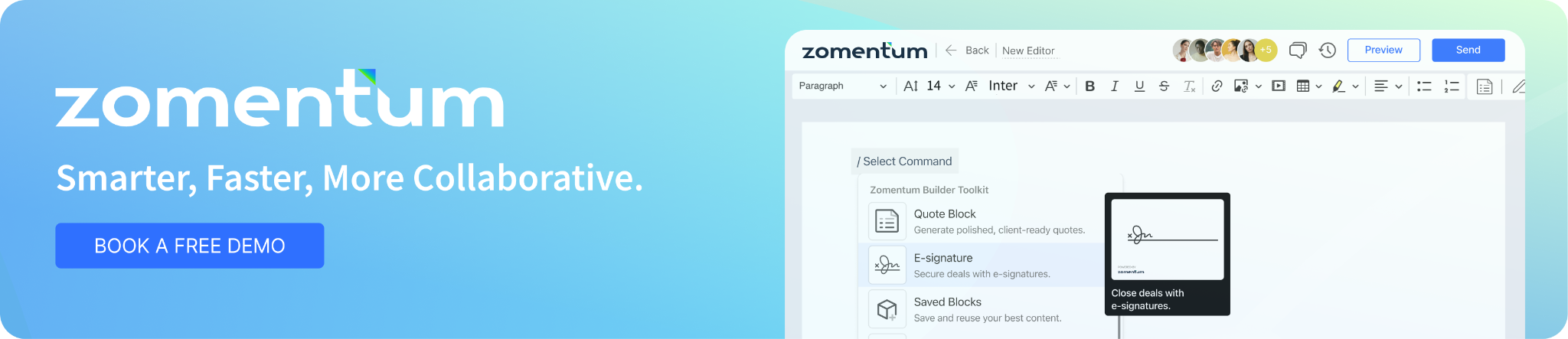 Zomentum's proposal-anchored checkout is genuinely excellent at what it does. A client opens a proposal, reviews the scope, signs, and pays the initial deposit all in a single guided session. Deal-closing, upfront collection, and contract execution happen in one flow. For that moment, nothing in the MSP space matches it.