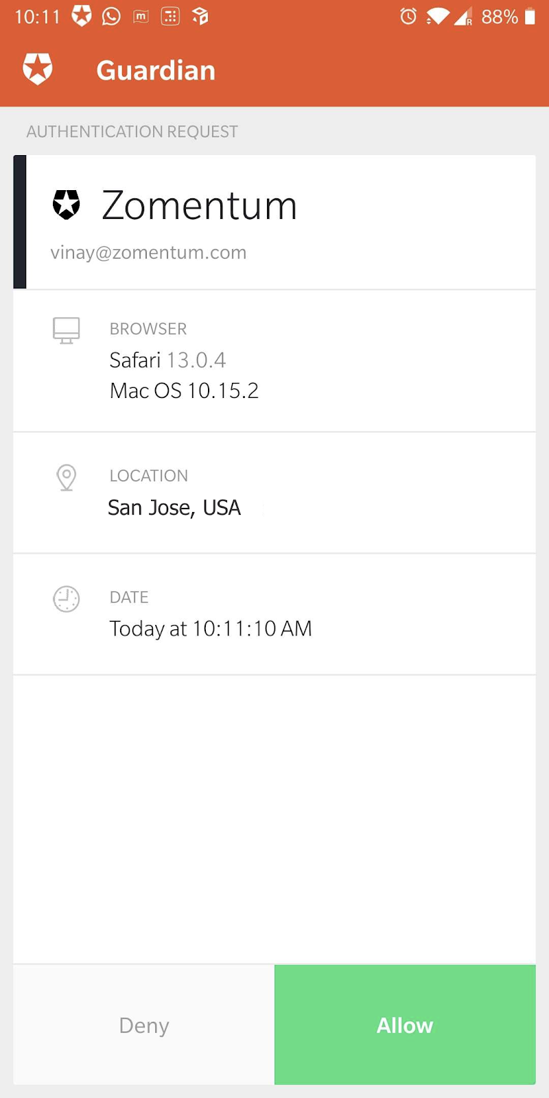 Once you enter your password in the login screen, you get a push notification on your mobile to confirm access to your Zomentum account. Alternatively, you also have an ability to enter an authentication code to login to your account. Both the push notification and the authentication is generated by the Guardian authenticator app on your android or iOS devices.