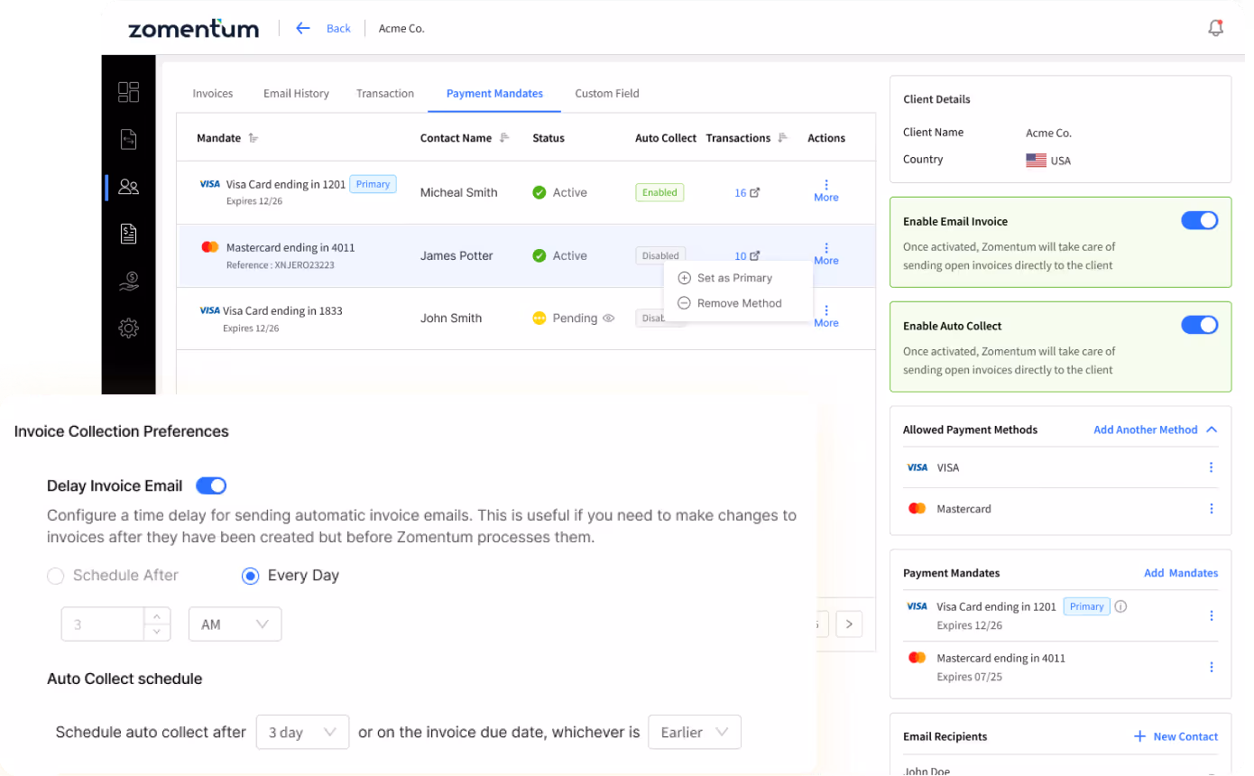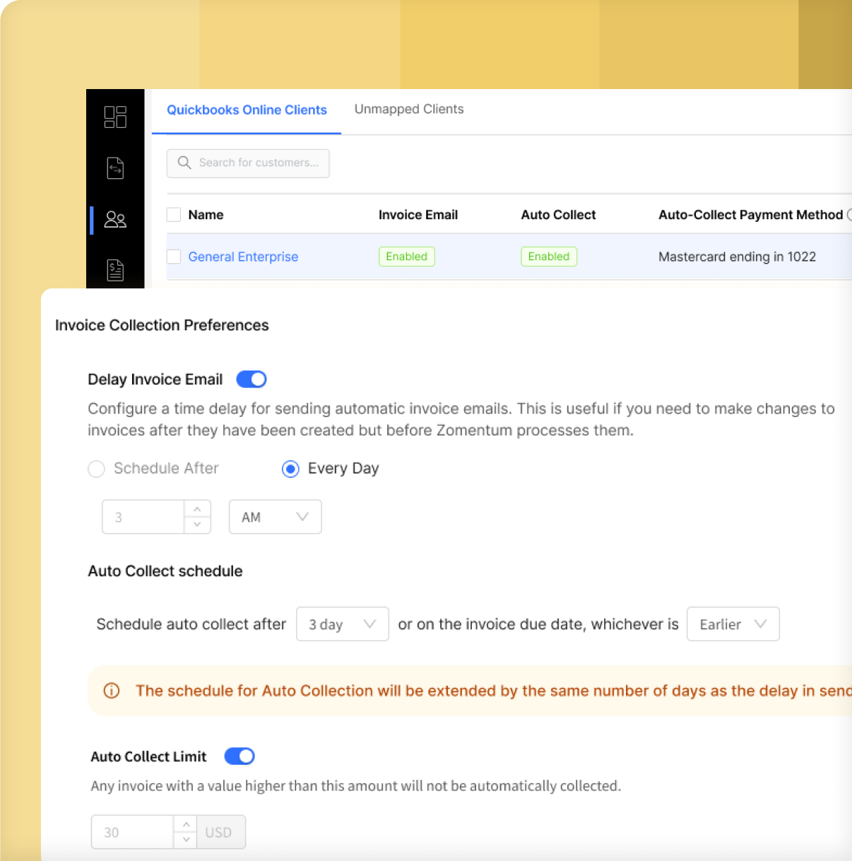 Yes. You can enable auto collect for any client or invoice. Zomentum charges the client’s saved card or ACH mandate based on the collection schedule you set. You can also delay invoice emails or manage settings at invoice or client level.
