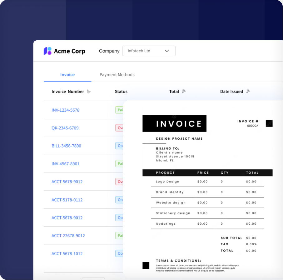 Give clients a simple, secure portal to view invoices, manage payment methods, and pay instantly.