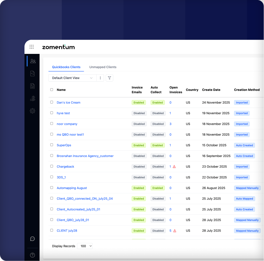 Once connected, invoices from QuickBooks or Xero sync into Zomentum Payments in real time. You do not need manual uploads. Any new invoice pulls in instantly and follows your payment and auto collect settings.