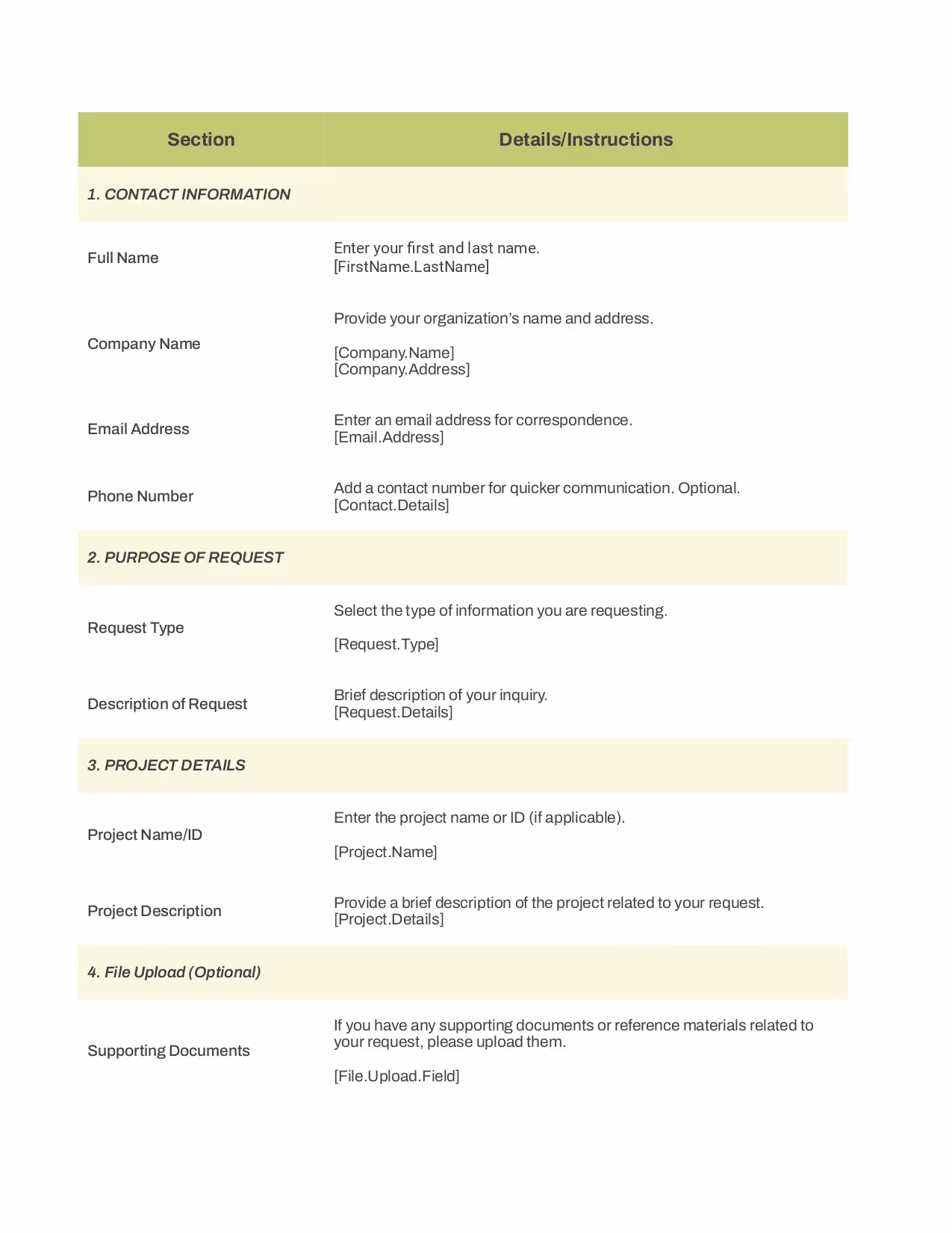 An effective information request form should include several key components to ensure comprehensive data collection and clear communication. These components are: