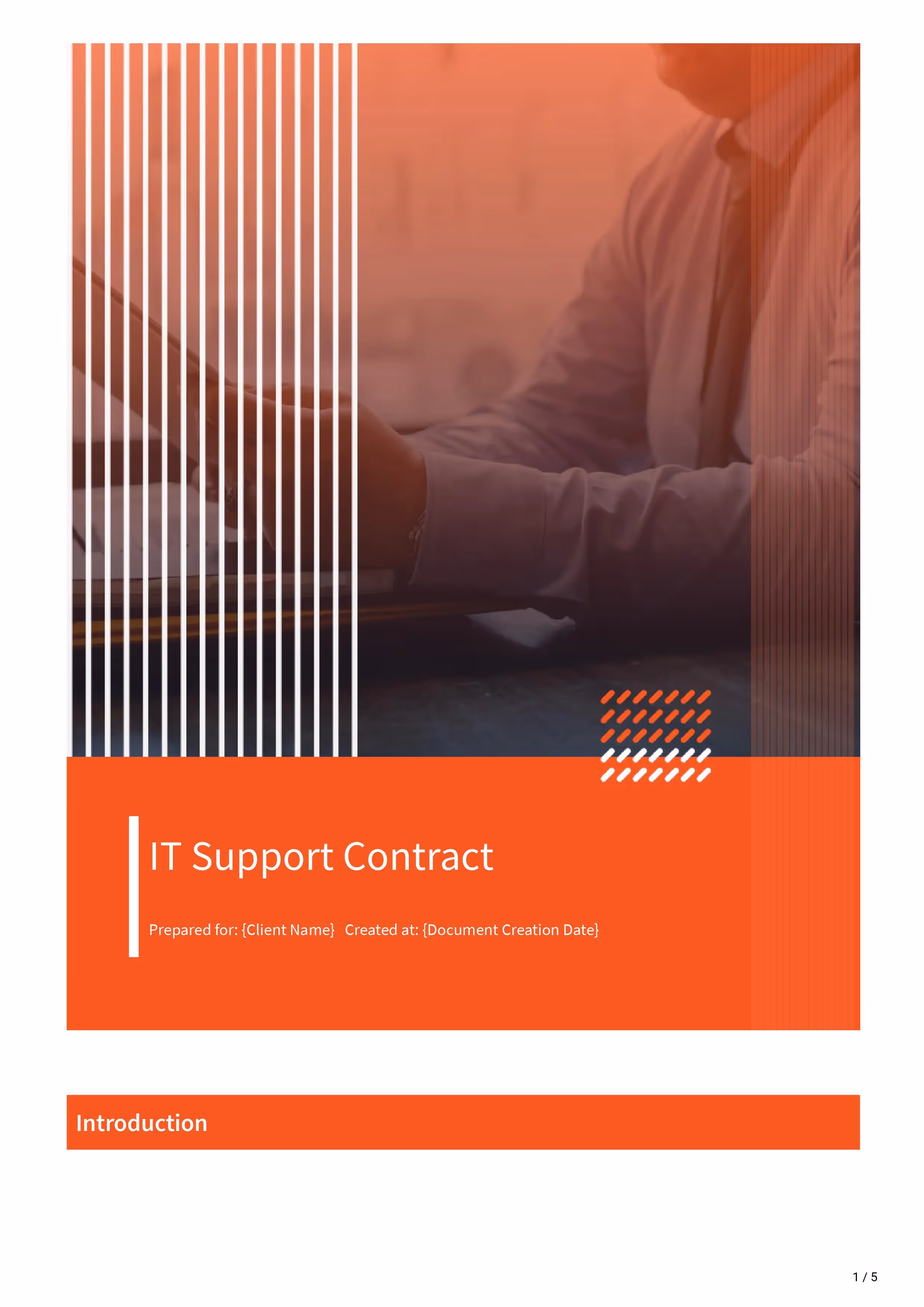 Transform the way you manage IT support contracts with our cutting-edge IT Support Contract Template. Whether you're a seasoned IT service provider or just starting out, this template provides a solid foundation for creating compelling proposals that win over potential clients. From outlining the services to be performed and support tiers, to defining the terms of acceptance and including a legally binding e-sign section, this template covers it all. Additionally, it allows you to specify the hours of coverage, customize quotes to include product bundles, and define roles and access definitions. Download our IT Support Contract Template now and present your clients with a comprehensive and professional contract.