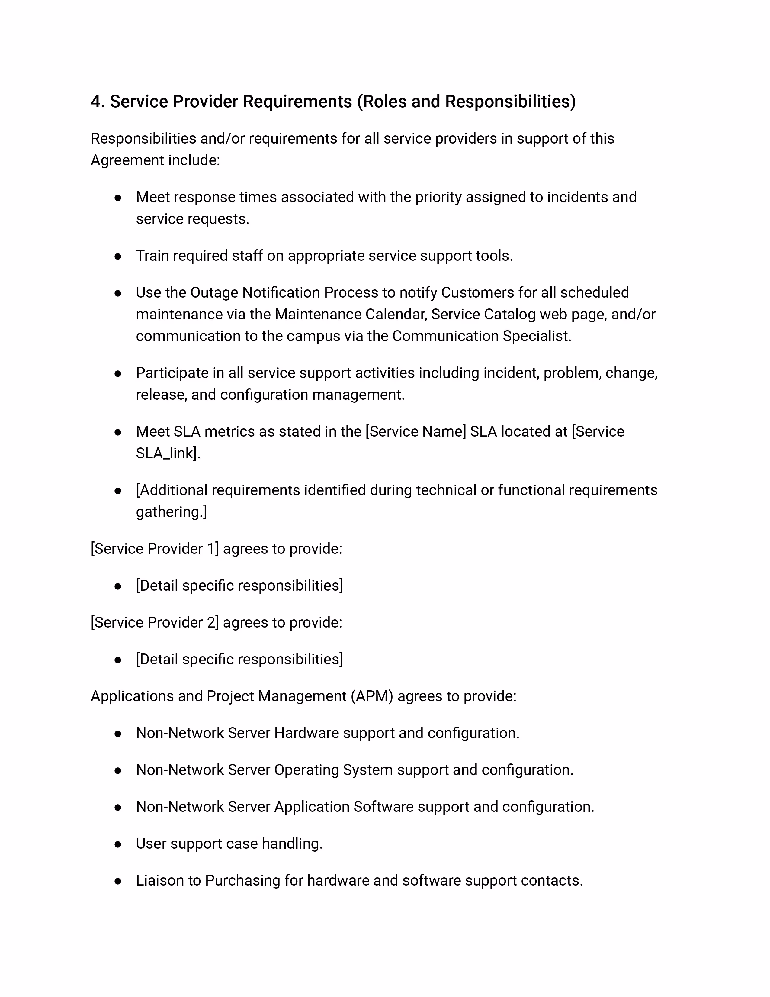 Ideal for organizations aiming to enhance their internal service support structures, our OLA template provides a robust framework for managing service expectations and performance.