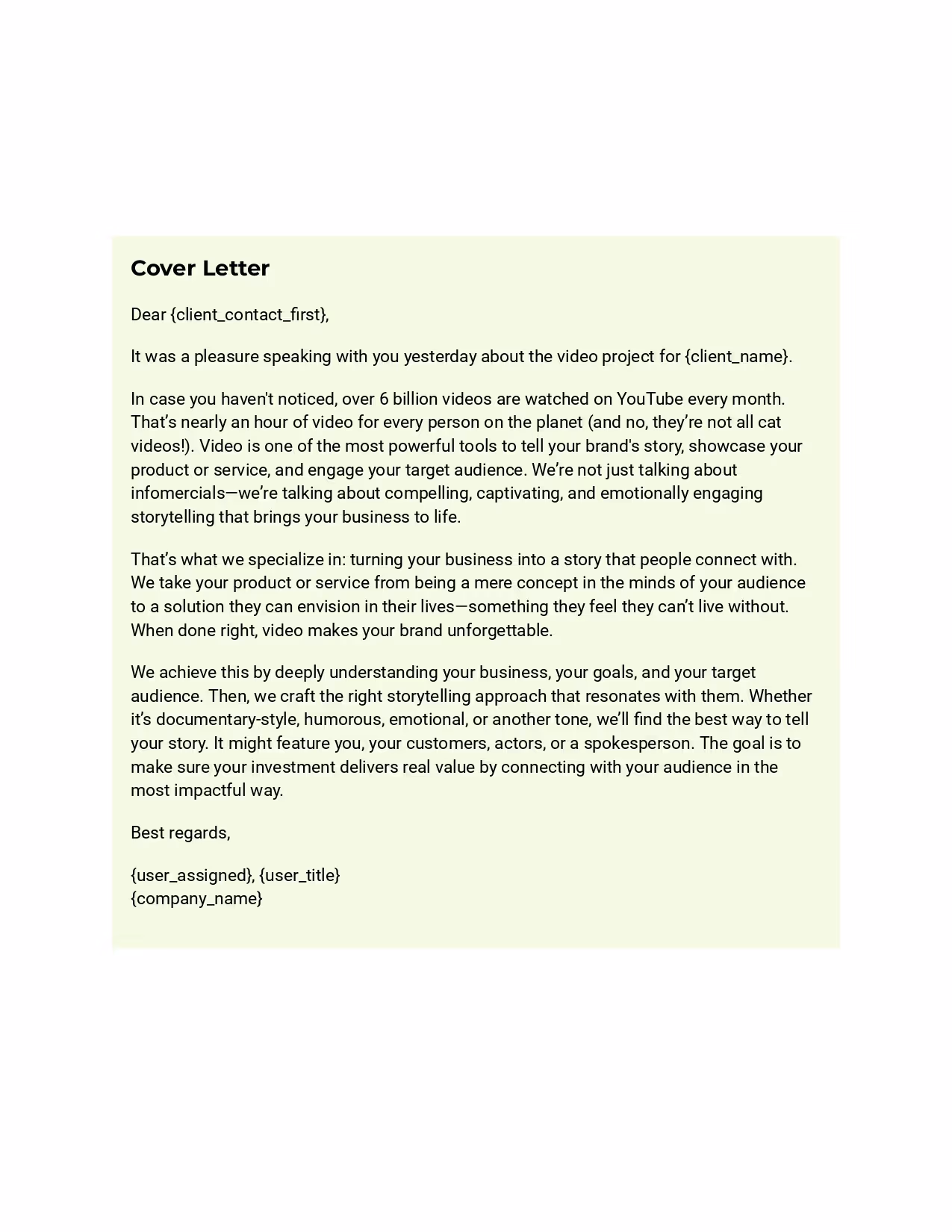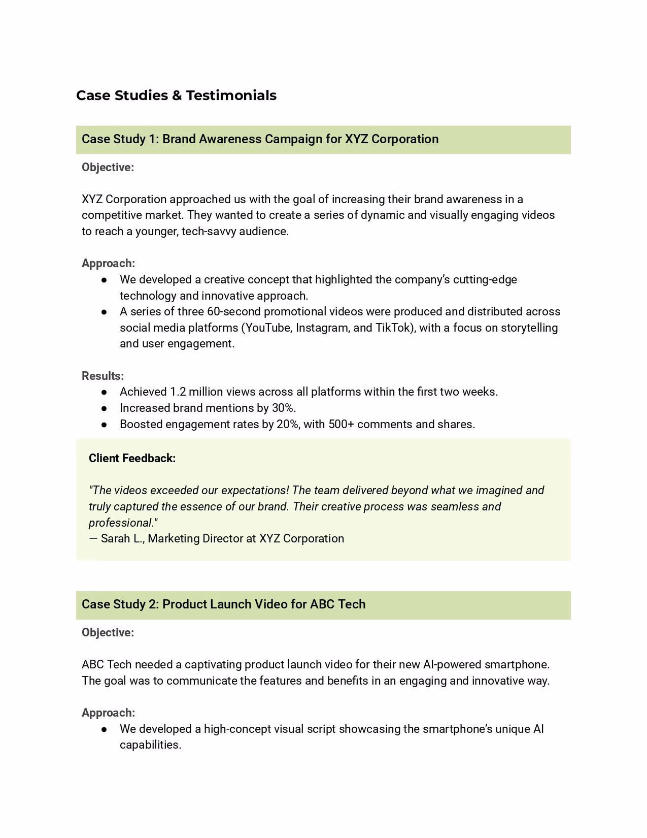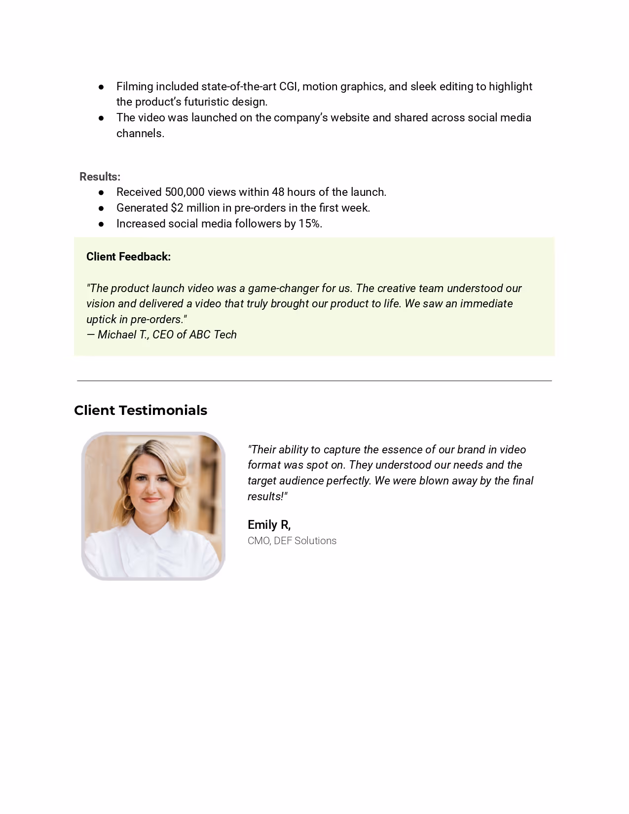 Provide a timeline with key milestones. Outline the budget, including costs for crew, equipment, locations, and editing. Lastly, add terms for revisions, rights, and delivery. Ensure clarity and professionalism while addressing the client’s objectives and demonstrating your ability to meet their needs.