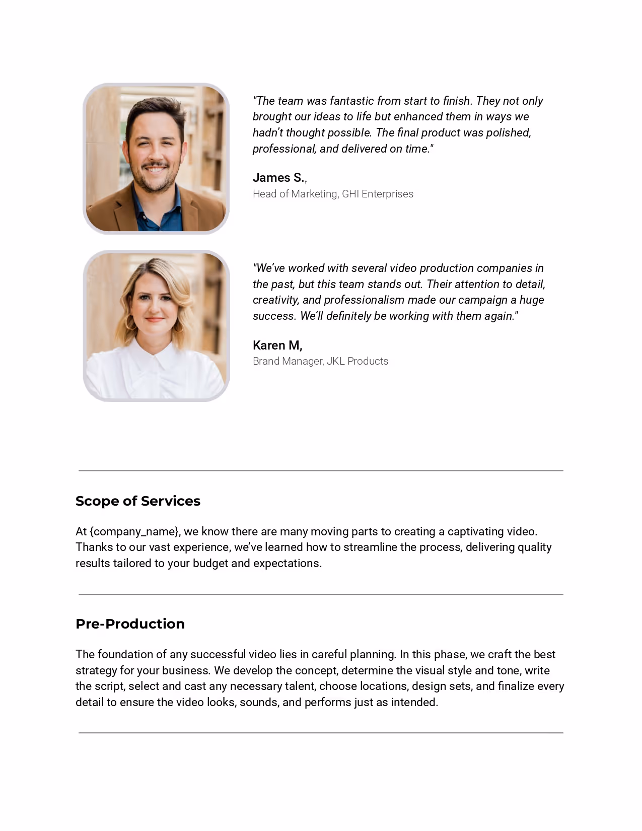 Our video production proposal template comes with a pre-structured layout that helps you craft professional proposals in no time.