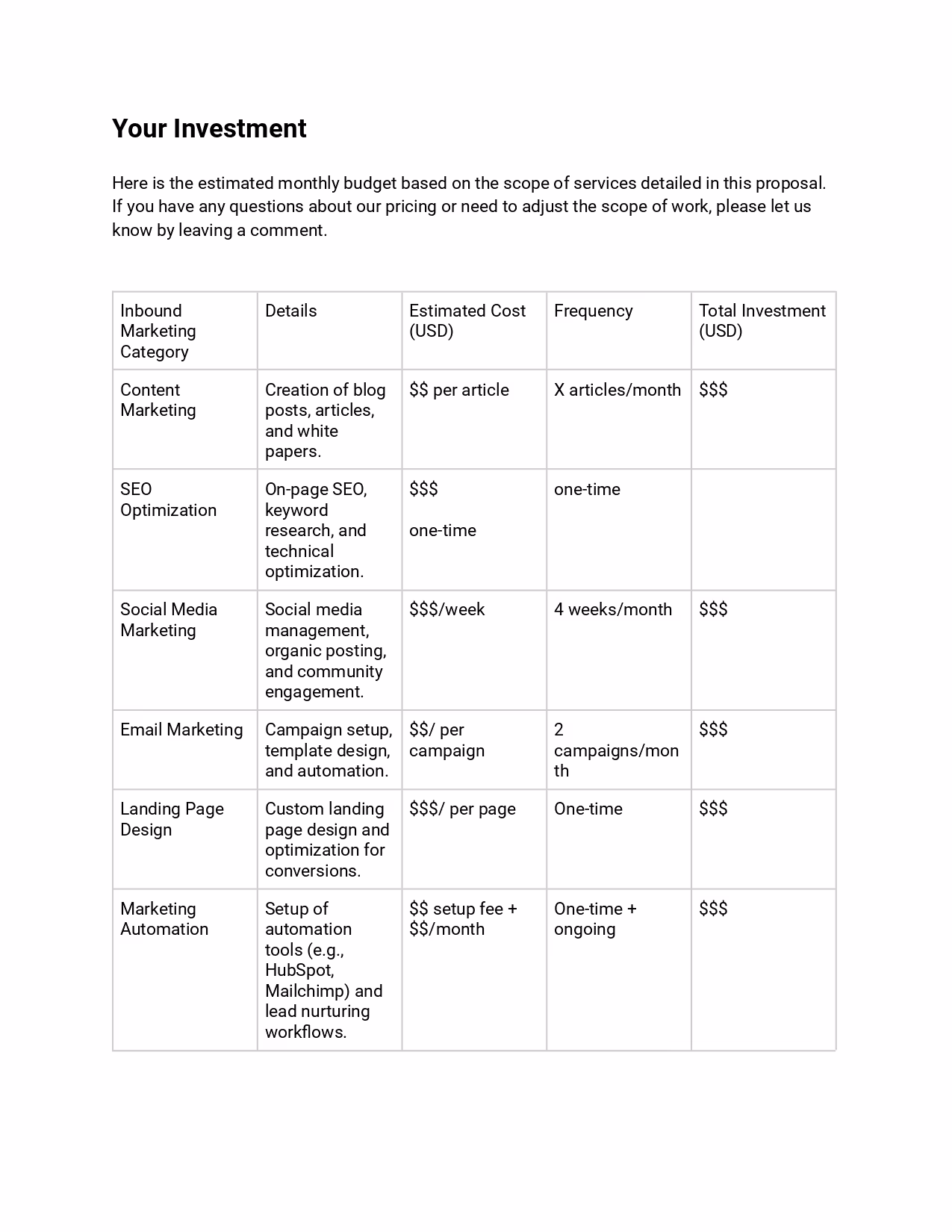 An inbound marketing proposal should encompass a clear overview of the project goals, target audience, and buyer personas. It should outline the proposed strategies, including content creation, SEO, social media engagement, and lead nurturing techniques. A detailed timeline for implementation, along with milestones, is essential. The budget breakdown should highlight costs for tools, resources, and advertising. Additionally, the proposal should include metrics for measuring success, such as traffic growth, conversion rates, and ROI projections. Lastly, a summary of the team's qualifications and previous successes can help build trust and credibility with potential clients.